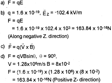 A particle of mass 1 x 10-26 kg and charge 1.6 x 10-19 C travelling with a velocity of 1.28 x 106 m/s in the +X direction enters a region in which a uniform electric field § and a uniform magnetic field of induction B are present such that Ex = Ey = 0 and Ez = – 102.4 kV/m and Bx = Bz = 0, By = 8 x 10-2 wb/m2. The particle enters this region at the origin at time t = 0. (March – 2009)