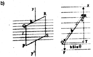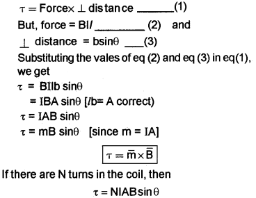 Considera rectangular coil PQRS of N turns, is suspended in a magnetic field, Let ‘I’ be the length (PQ) and ‘b’ be the bceadth (QR). When a current Iflows in the coil, each side produces a force. But the forces on PO and RS will produce a Torque.