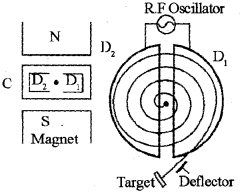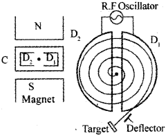 Cyclotron consists of two semicircular dees D1 and D2, enclosed in a chamber C. This chamber is placed in between two magnets. An alternating voltage is applied in between D1 and D2. Anion is kept in a vacuum chamber.
