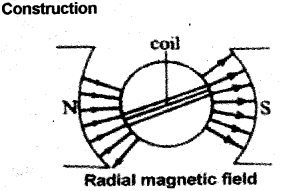 A moving coil galvanometer consists of rectangular coil of wire having area ‘A’ and number of turns ‘n’ which is wound on metallic frame and is placed between two magnets, The magnets are concave in shape, which produces radial field.