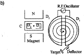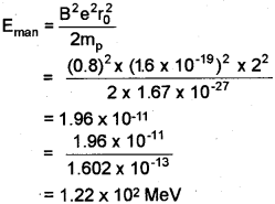 b) Find the energy of emergent protons (in MeV) coming from a cyclotron having dees of radius 2 metres, when a magnetic field of 0.8 T is applied. (Mass of proton = 1.67 x 10-27 kg)