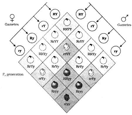 | The gametes RY and ry unite on fertilisation to produce the F1 hybrid RrYy. When Mendel self hybridised the F1 plants and found that the ratio in F2 is 9:3:3:1. |