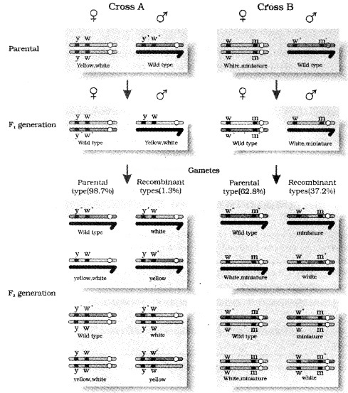 | For example the genes for the white and yellow were very tightly linked and showed only 1.3 per cent recombination while white and miniature wing showed 37.2 per cent recombination. |