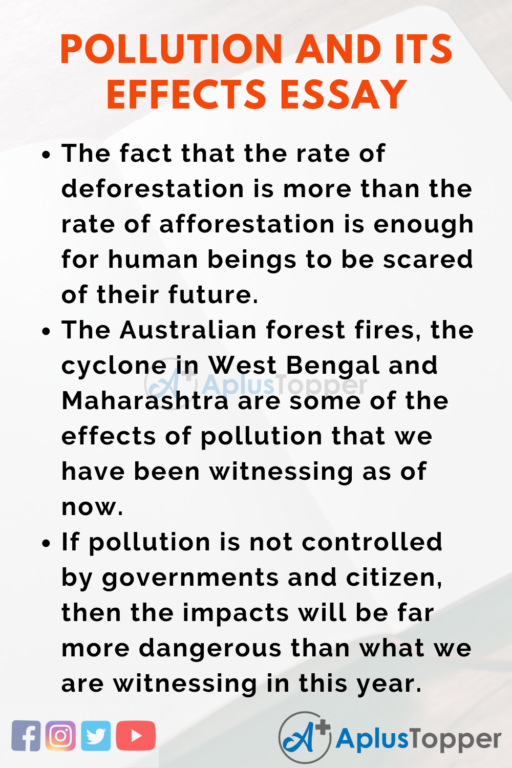600-word long Effects of pollution essay and 200-word short essay on effects of pollution are provided in this article. Both the essays can be used by students of class 6, 7, 8, 9, 10, 11 and 12 for test, examination, homework, assignment and essay writing competition.