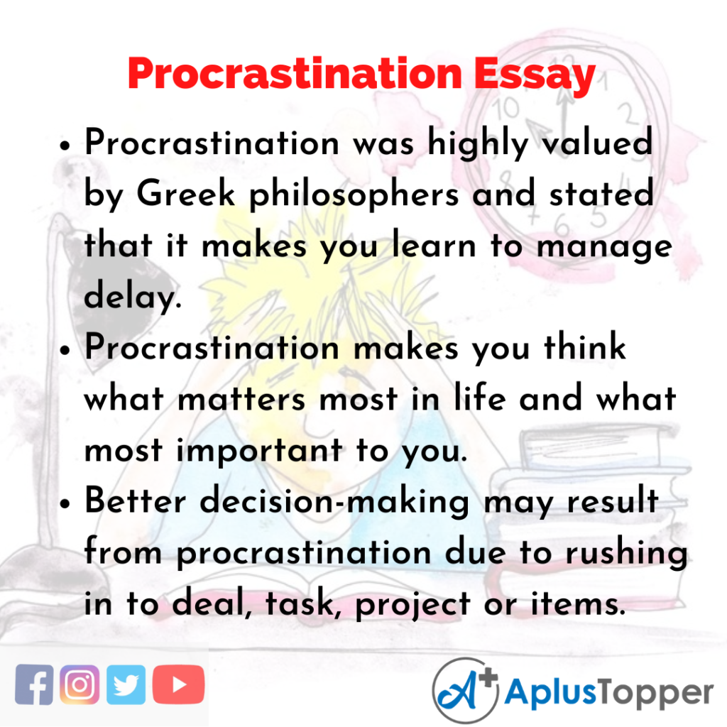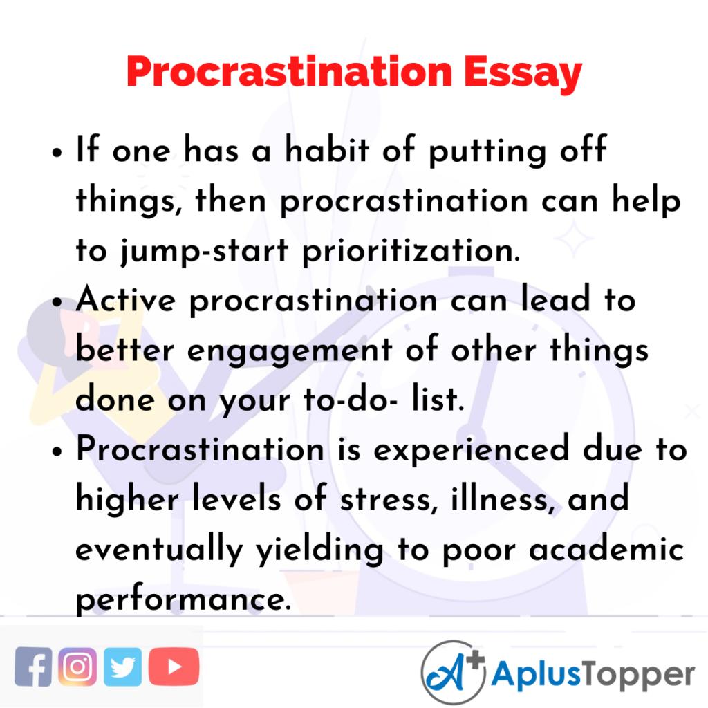 Procrastination Essay: Everyone procrastinates at some point. We put things off because we have too many other things on our plates or because we don’t want to do them. Big or small, putting things off-is part of human beings.