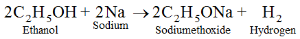 (ii) Reaction with Sodium : Alcohols are very weakly acidic. Ethanol reacts with sodium metal to form sodium ethoxide and hydrogen gas.