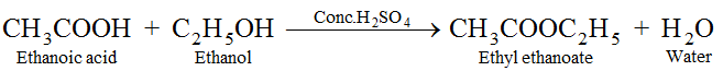 (vi) Esterification : Ethanol reacts with ethanoic acid in presence of concentrated H2SO4 to form ethyl ethanoate and water. The compound formed by the reaction of an alcohol with carboxylic acid is known as ester and the reaction is called Esterification. Esters are sweet fruity smelling compounds because they occur in fruits. They are used in ice creams, cold drinks and perfumes. The reaction takes place as follows.
