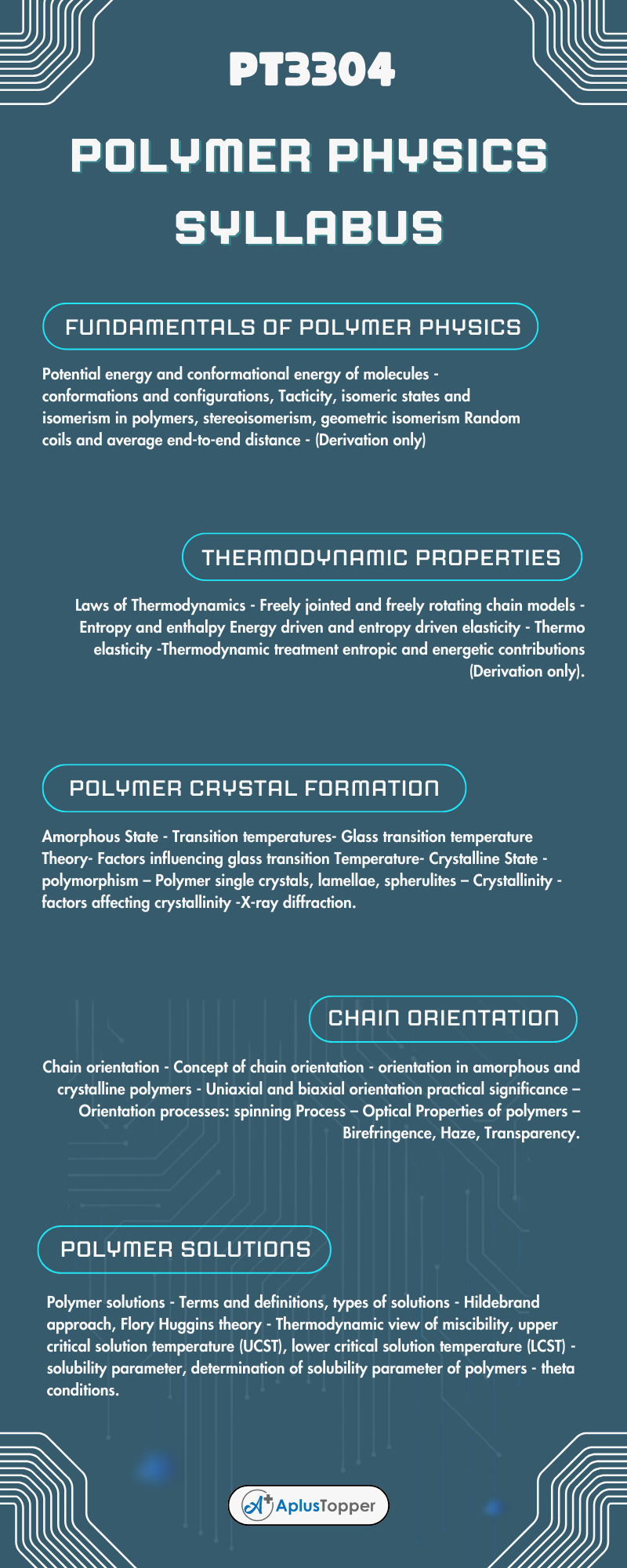 We tried our best to provide the following unit-wise PT3304 – Polymer Physics detailed Syllabus. We sum up the appropriate textbooks and references to this page. If you have any doubts regarding the syllabus, you can simply comment below on the following page. Hope this information is useful. Share it with your classmates. Thanks for landing on this page.