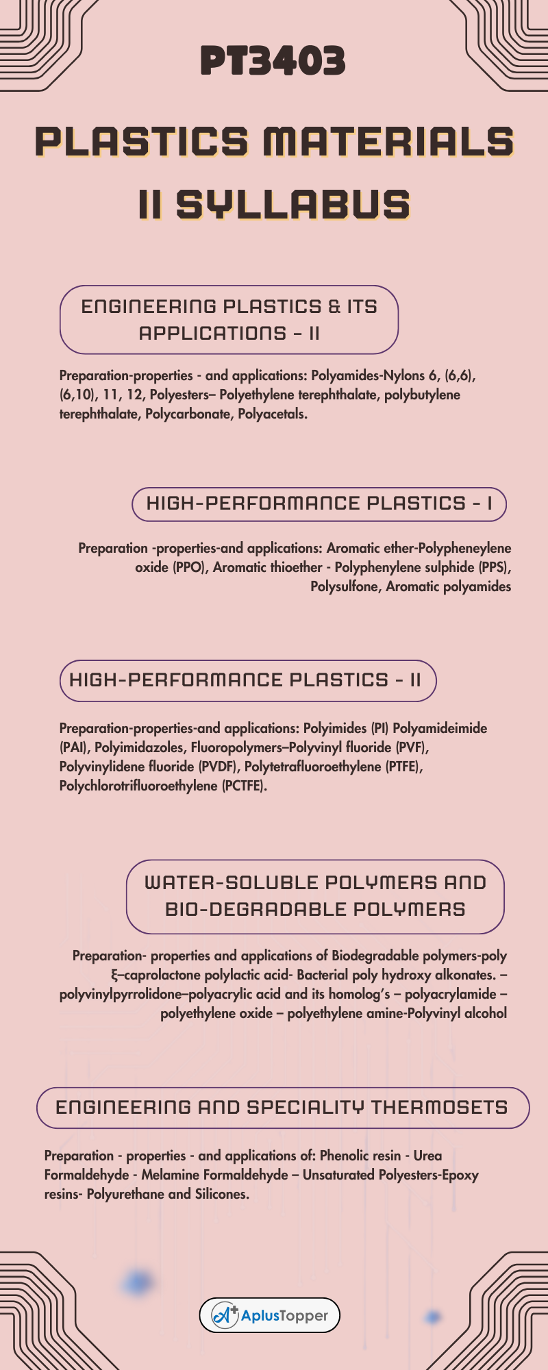 We tried our best to provide the following unit-wise PT3403 – Plastics Materials II detailed Syllabus. We sum up the appropriate textbooks and references to this page. If you have any doubts regarding the syllabus, you can simply comment below on the following page. Hope this information is useful. Share it with your classmates. Thanks for landing on this page.