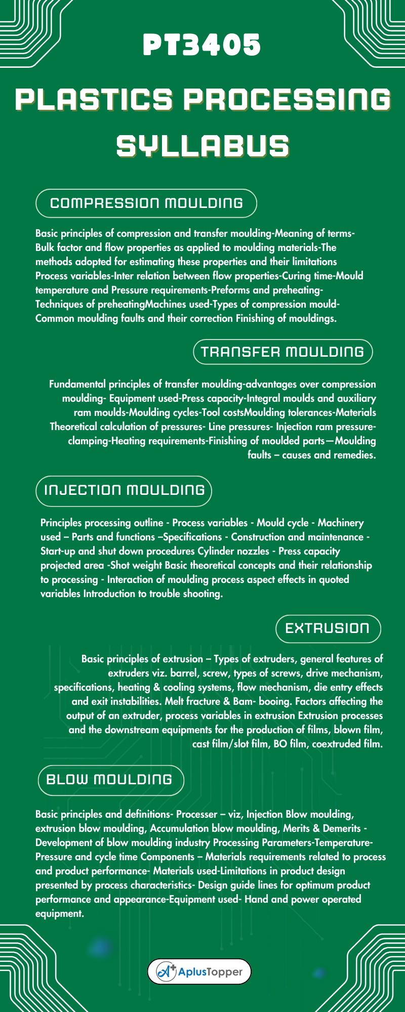 We tried our best to provide the following unit-wise PT3405 – Plastics Processing detailed Syllabus. We sum up the appropriate textbooks and references to this page. If you have any doubts regarding the syllabus, you can simply comment below on the following page. Hope this information is useful. Share it with your classmates. Thanks for landing on this page.