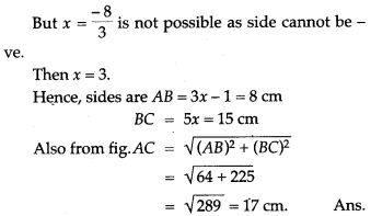 Question 48. The side (in cm) of a triangle containing the right angle are 5x and 3x – 1. If the area of the triangle is 60 cm². Find the sides of the triangle.