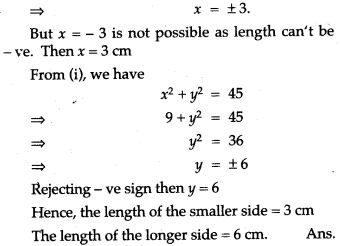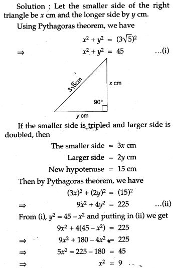 Question 1. The hypotenuse of a right angled triangle is 3√5. If the smaller side is tripled and the larger side is doubled, the new hypotenuse will be 15 cm. Find the length of each side.