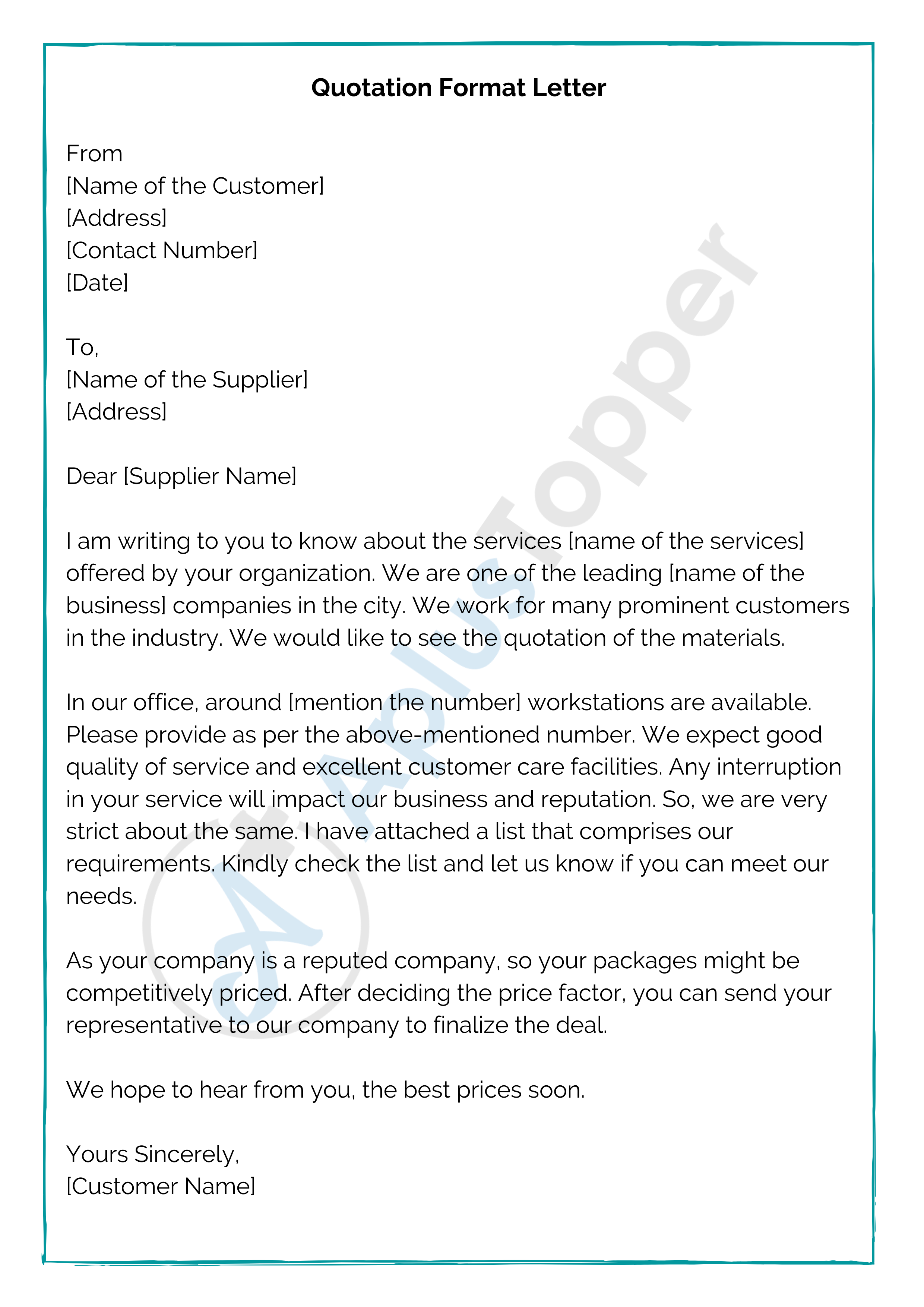 Quotation Format Letter: It is a letter written by a customer to enquire about the selling price of a service or goods offered by a supplier. The supplier responds including the details of the quoted price and terms and conditions of the delivery of the services or goods to the customer through Quotation Letter Format. It is used more in business organizations while buying any products or goods.