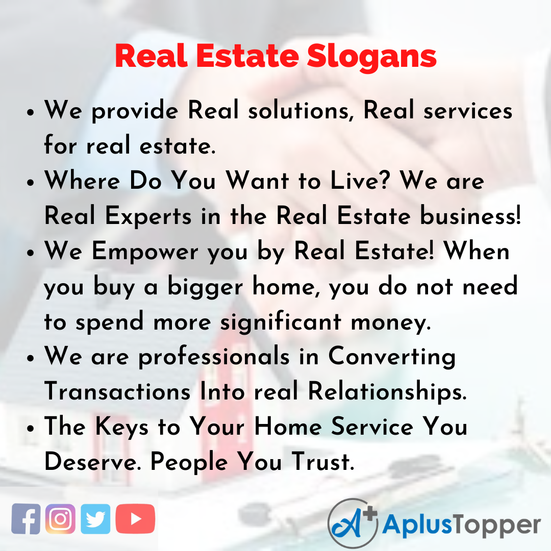Real Estate Slogans: Real estate is referred to as the land, including the air above it and the ground below it. It also includes buildings or structures. You can also refer it to realty. It majorly covers residential housing, commercial offices, trading spaces such as theatres, hotels, restaurants, and industrial buildings such as factories and Government buildings.