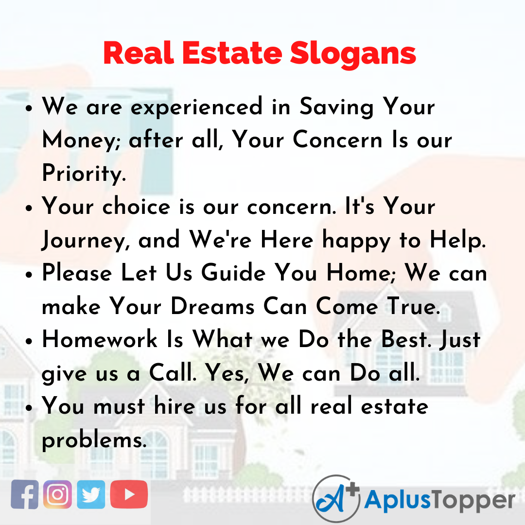 The following are fifteen slogans dedicated to spreading awareness about Real Estate. These slogans are adequate to impact society positively and bring about a positive change.