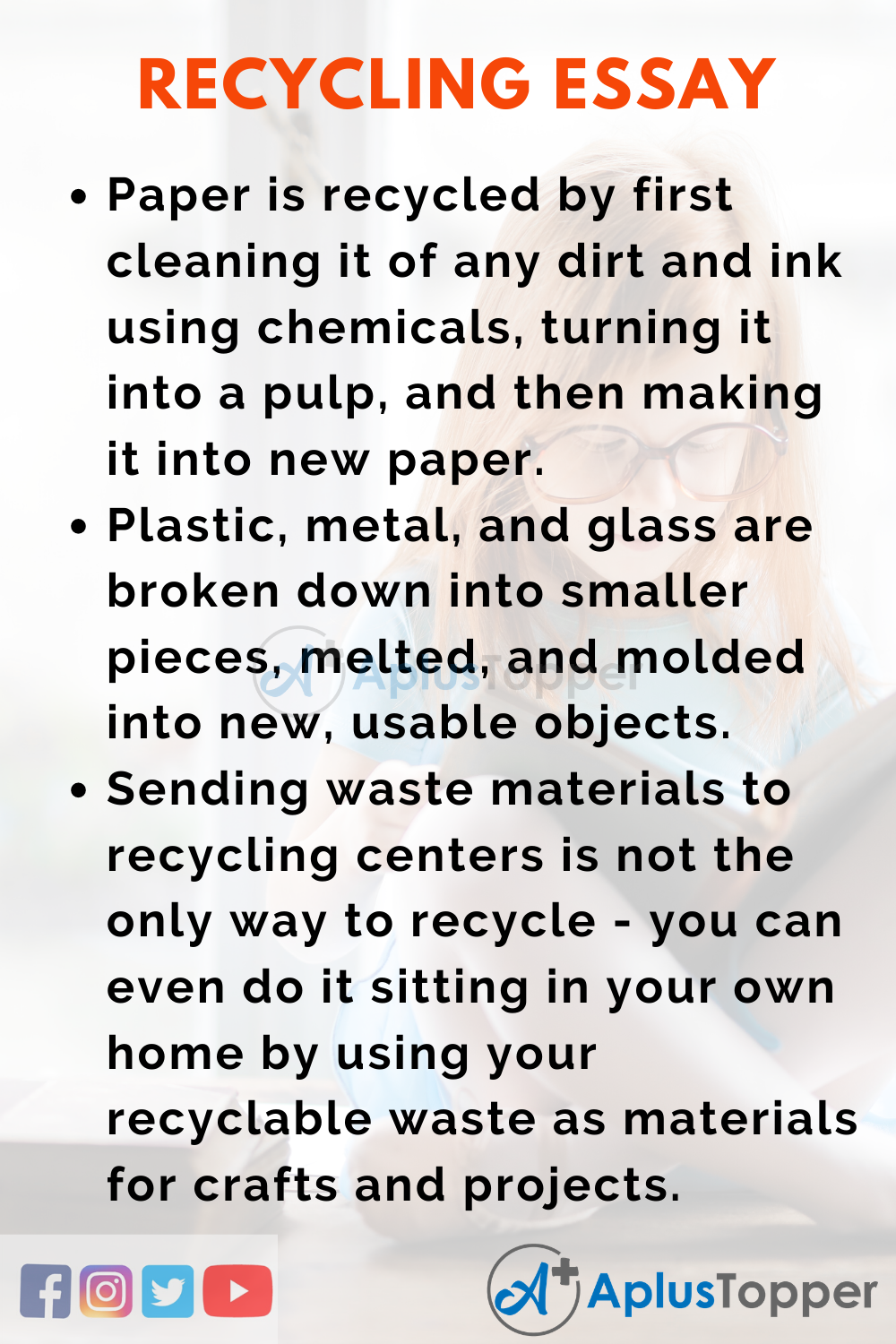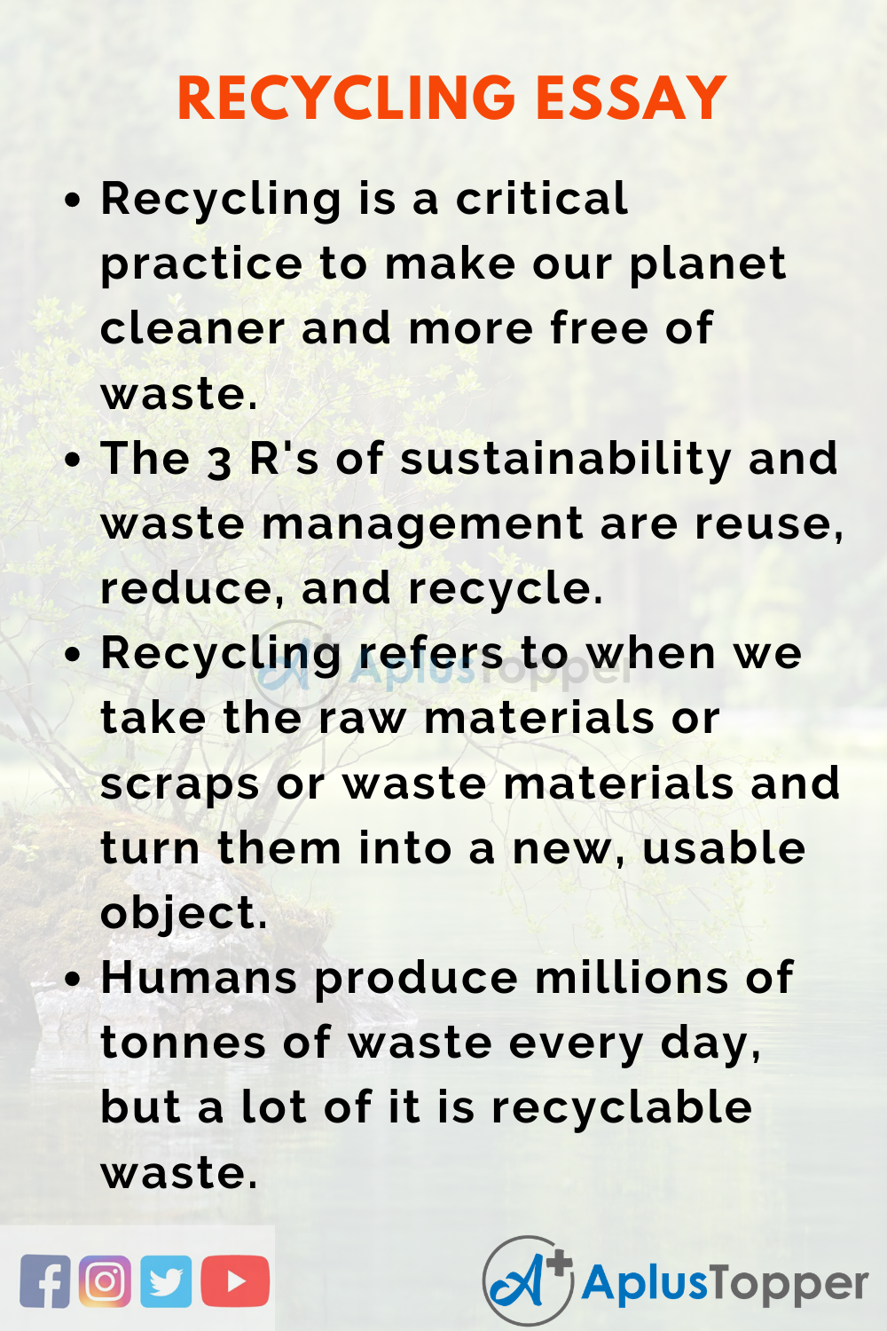 Recycling Essay: Recycling is one of the 3 R’s, reduce, reuse, and recycle, which aims at promoting sustainable living. Recycling refers to when we convert something which can be considered waste into a new product. For example, when you buy a plastic bottle of water, you can send it to recycling centers to be made into something like plastic bags rather than throwing it away. Recycling is one of the most important waste management practices, and it is essential to follow for sustainable living.