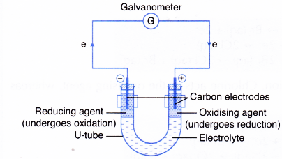 - However, when the reducing and oxidising agents are separated by an electrolyte in a U-tube as shown in Figure 3.6, the transfer of electrons occurs through the connecting wires and can be detected by a galvanometer.