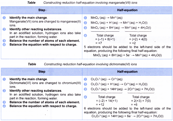 When polyatomic ions such as manganate(VII) ion and dichromate(VI) ion are involved in redox reactions, the half-equations are more complex. The following tables illustrate how the half-equations are constructed.