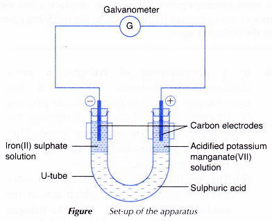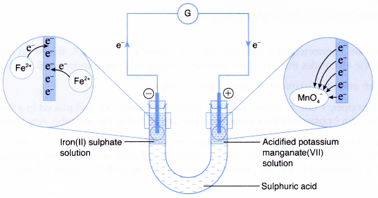 | (a) The electrode in the iron(II) sulphate solution acts as the negative terminal while the electrode in the acidified potassium manganate(VII) solution acts as the positive terminal. | Electrons flow from iron(II) sulphate solution to acidified potassium manganate(VII) solution. |