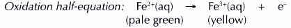 | (b) Iron(II) sulphate solution changes from pale green to yellow. It gives blood-red colouration with potassium thiocyanate solution. | At the end of the reaction, iron(III) ions are present. Iron(II) ions have changed to iron(III) ions. |