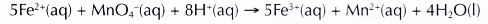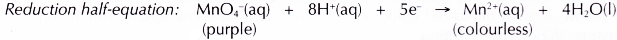 | (c) The purple acidified potassium manganate(VII) solution decolourises. | Manganate(VII) ions that give the solution its purple colour are used up in the reaction. |