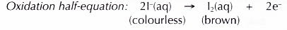 | (b) The colourless potassium iodide solution turns brown. It gives a dark blue colouration with starch solution. | At the end of the reaction, iodine is present. Iodide ions have changed to iodine. |