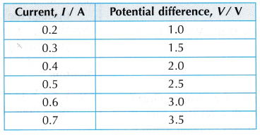 - Step 2 is repeated by adjusting the rheostat to fix the current at I = 0.3 A, 0.4 A, 0.5 A, 0.6 A and 0.7 A. The corresponding values of potential difference across the wire are recorded.
