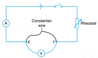 - The battery, ammeter, voltmeter and rheostat are connected in a circuit as shown in Figure. The 50 cm constantan wire is connected across terminals X and Y.