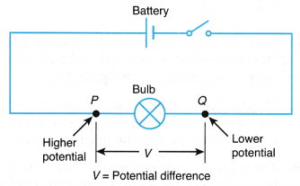 - Similarly, when a battery is connected to a bulb in a circuit, as shown in Figure, it creates a potential difference, that is, a difference in the potential energy of the charges in the conductors connected to its terminals. When the switch is off, the positive terminal, P is at a higher potential and the negative terminal Q is at a lower potential. When the switch is on, the potential difference between the two terminals causes the charges to flow across the bulb in the circuit and light up the bulb.