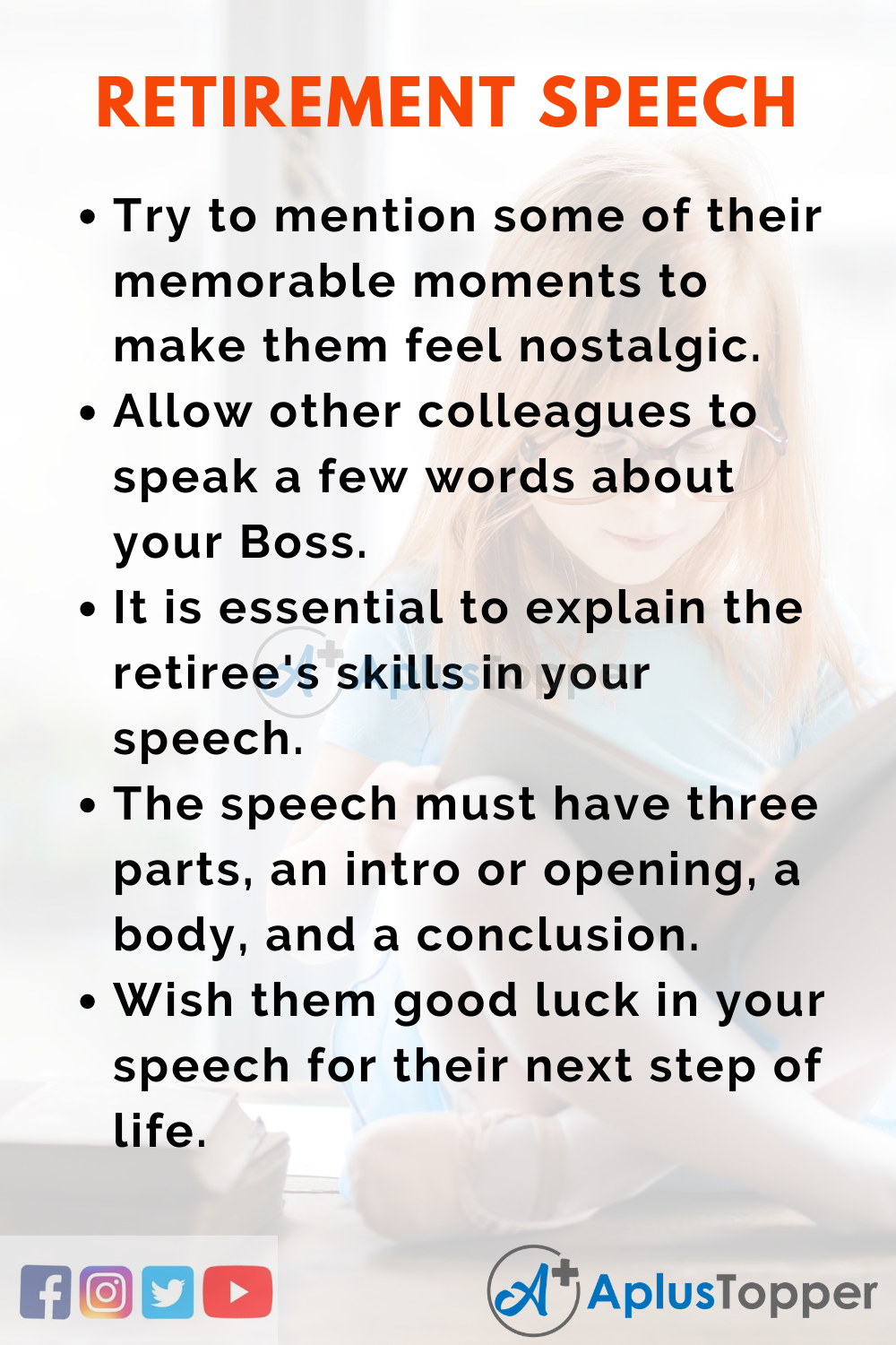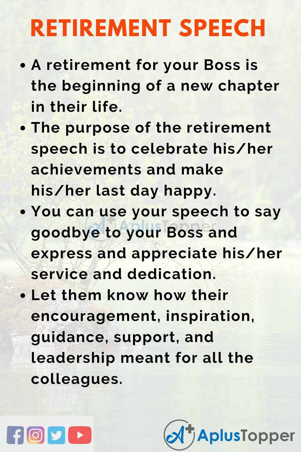 - The purpose of the retirement speech is to celebrate his/her achievements and make his/her last day happy.