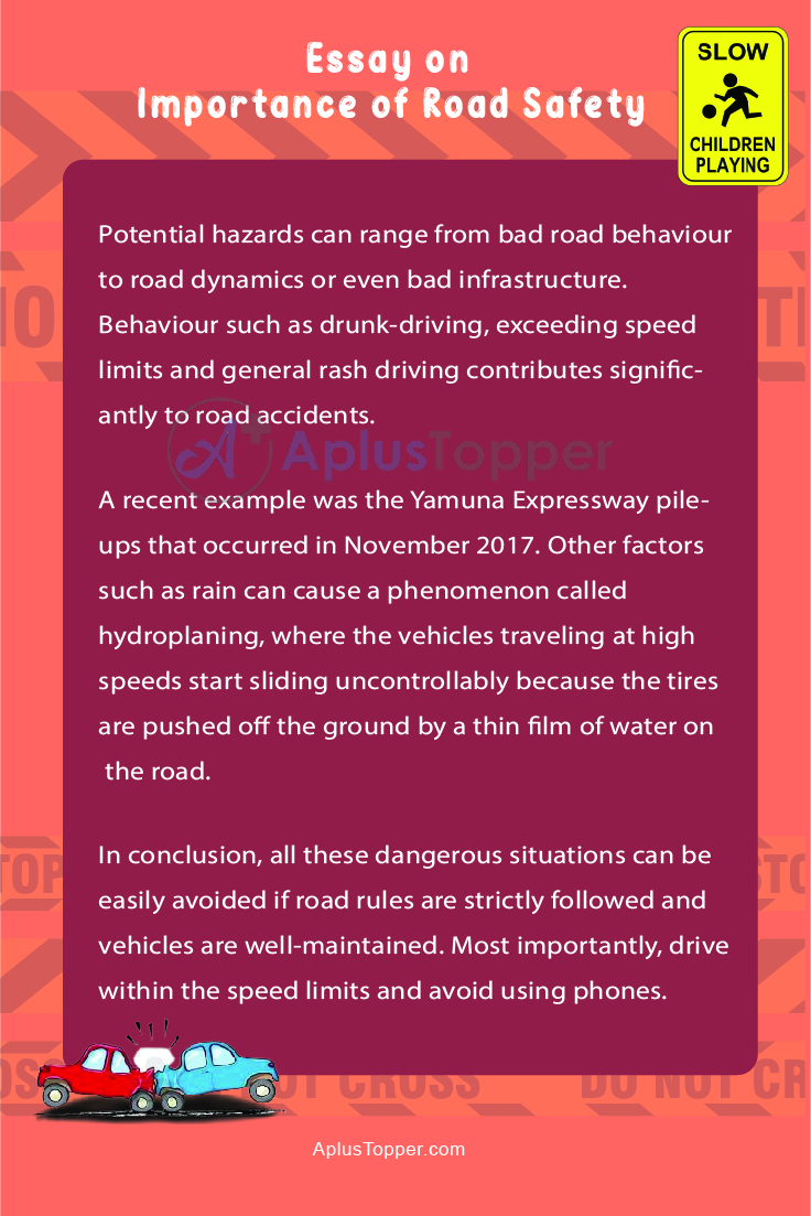 Road safety essay aims to present some of these dangers and the solutions to these problems. From government regulations to pedestrian safety, explore various means to stay safe on the road with these essays. However, from an academic perspective, there are a few guidelines to follow when writing an essay. Consider adopting these tips if you wish to secure more marks. we will soonly Update Road Safety Essay in Hindi, Tamil, Telugu. Read on to find an Essay about Road Safety.
