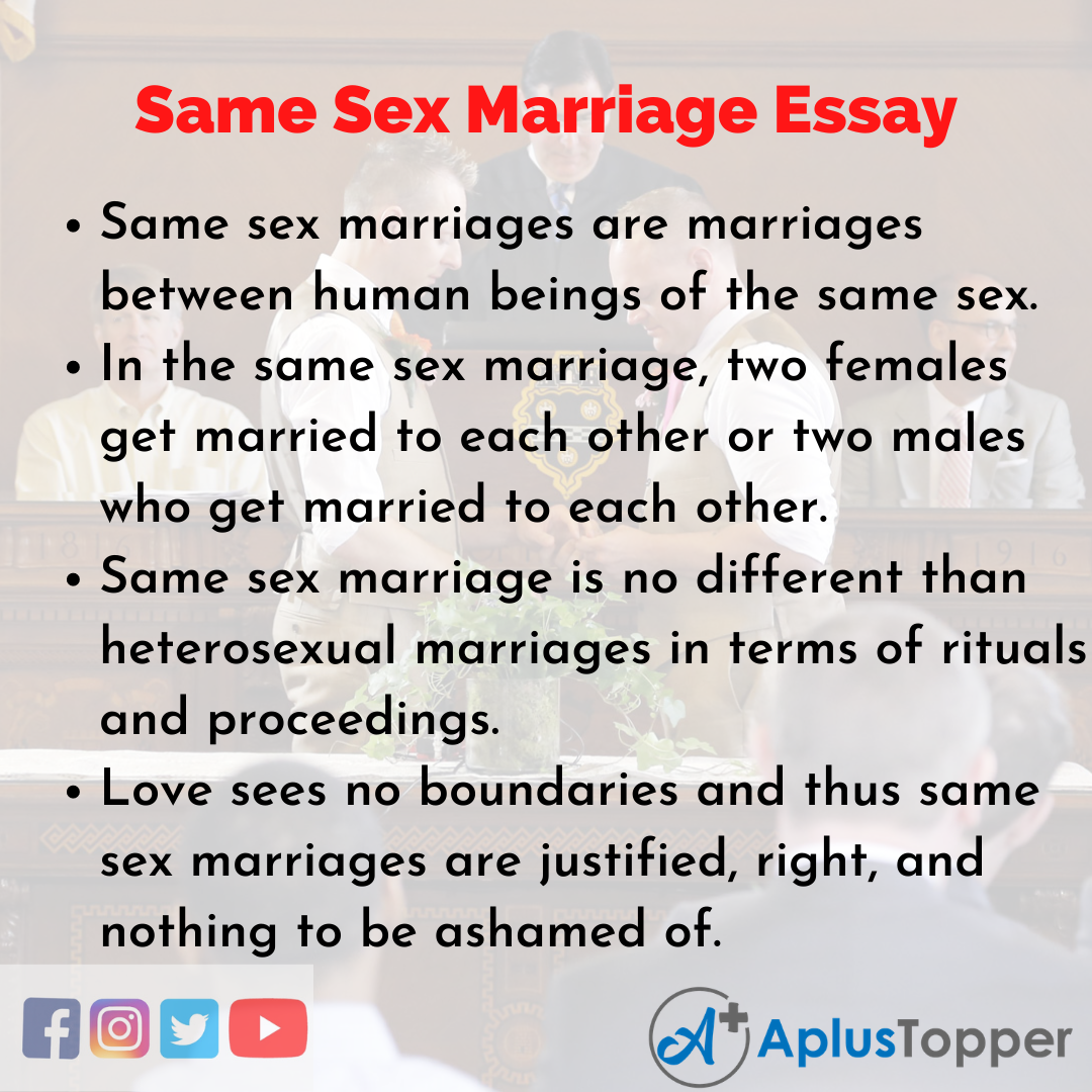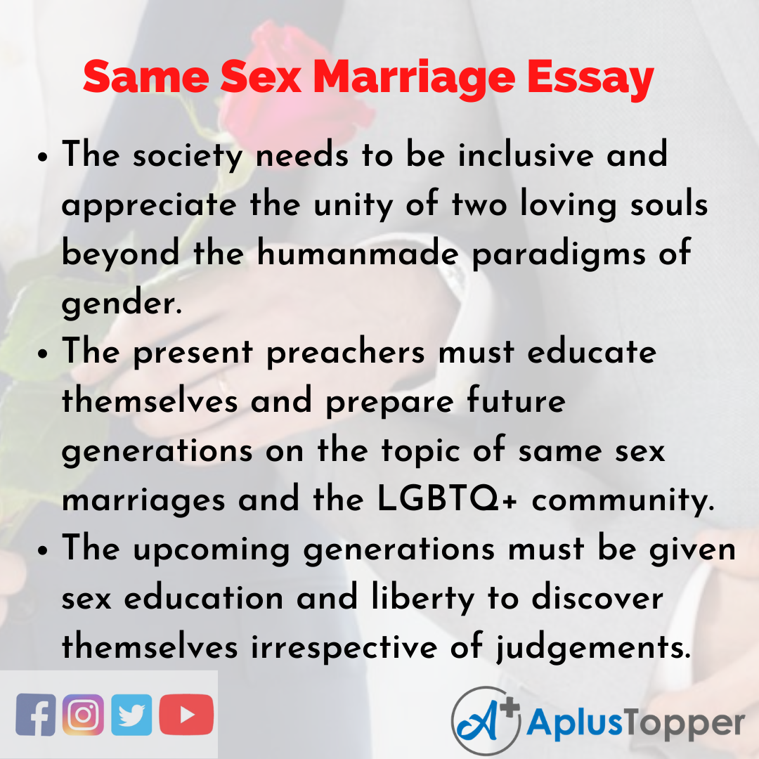 Same Sex Marriage Essay: Sex is a biological term that differentiates between two biologically different human beings- the Male and the Female. When we talk about same sex marriage, we are intending to a sacred union of two people belonging to the same sex. This union can be called when two females get married to each other or when two males get married to each other. It is not the sex or gender that binds two souls together but love and care for each other.