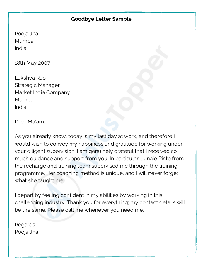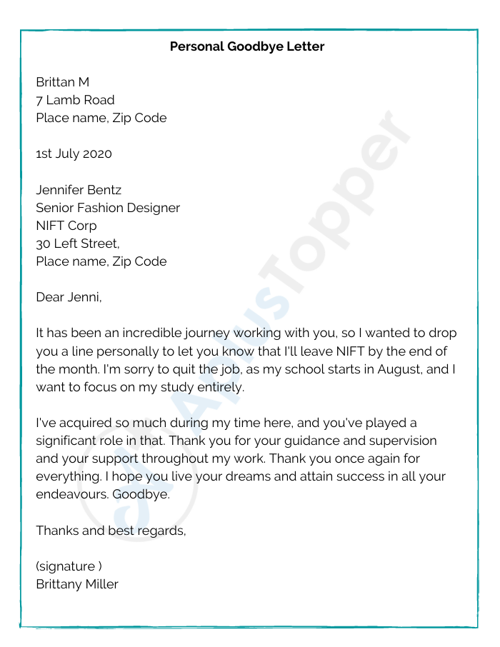 Sample Goodbye Letters: A Goodbye Letter is an informal business document. Therefore, there’s no actual standard format to follow. Generally, goodbyes are a time to change the routes or part ways. In both cases, the letter should be written in a different style. In the first place, the letter should be informal as you are terminating a relationship or a bond that is your personal choice. You can also write a casual goodbye note according to the relation.