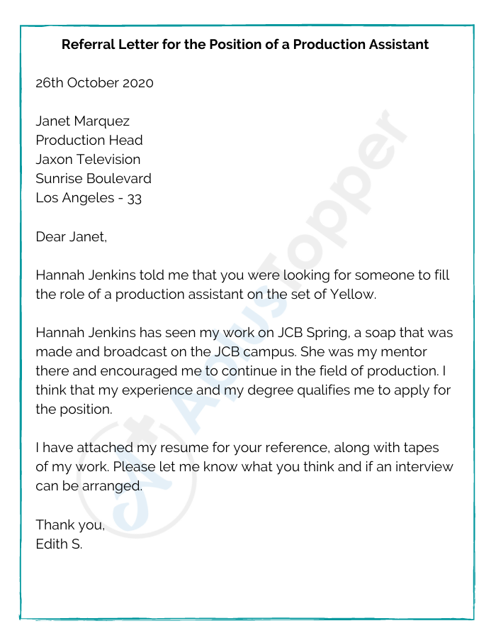 Referral Letter for the Position of a Production Assistant