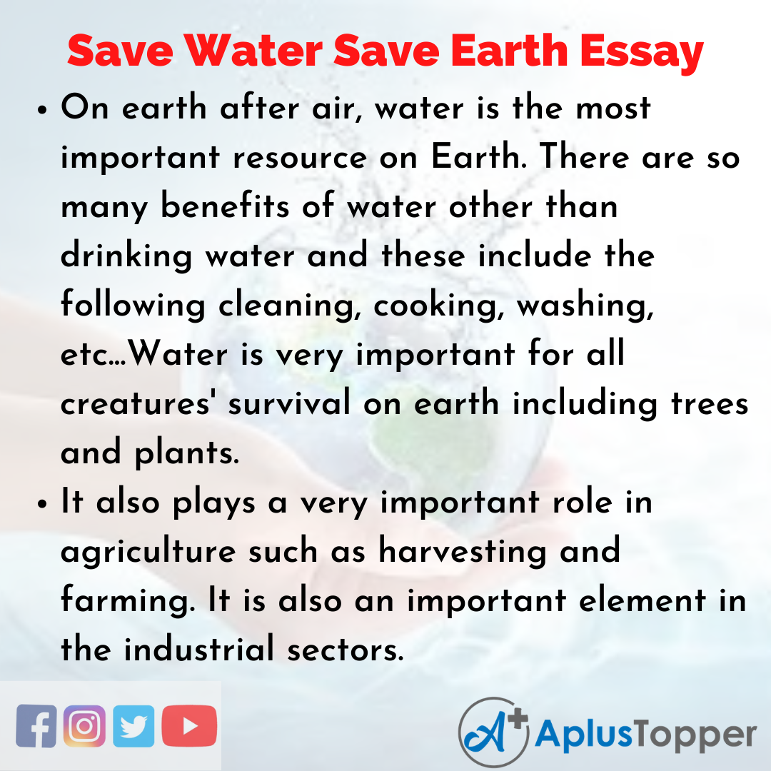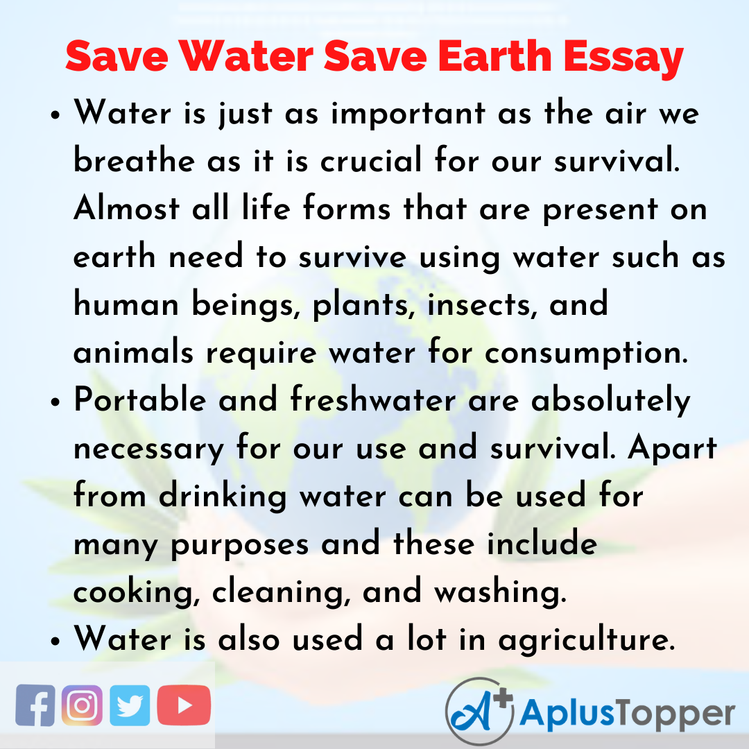 Short Essay on Save Water Save Earth is usually given to classes 1, 2, 3, 4, 5, and 6.