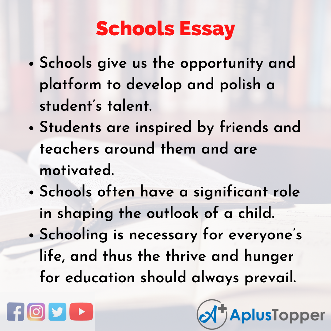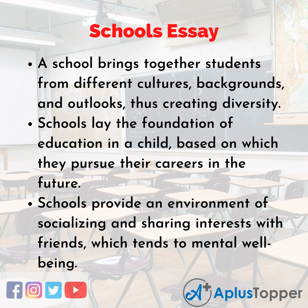 Schools Essay: Schools are established organizations that provide a learning as well as growing environment to children. Most countries have this system of formal education to lay the foundation of learning in a student.