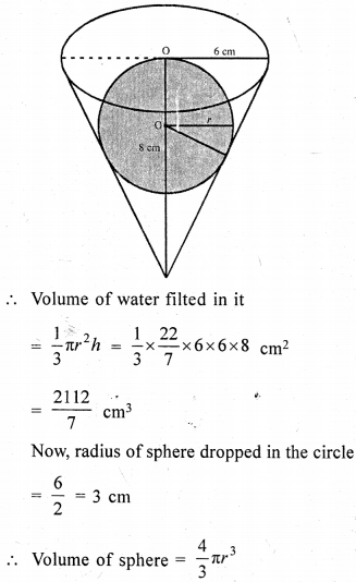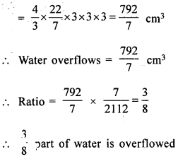 A conical vessel of radius 6 cm and height 8 cm is completely filled with water. A shpere is lowered into the water and its size is such that when it touches the sides it is just immersed. What fraction of water overflows?