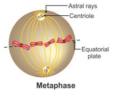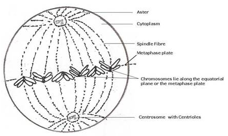 (d) Metaphase. The centromeres of chromosomes are drawn to the equator by equal pull of two chromosomal spindle fibres that connects each centromere to the opposite poles, forming a metaphasic plate.