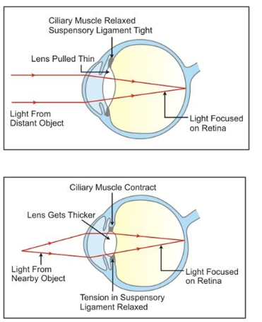 Accommodation is the process of focusing the eye at different distances. This is mainly brought about by a change in the curvature of the lens. When the ciliary muscles contract, the lens becomes thicker and we are able to focus a nearby object. On the other hand when the ciliary muscles relax, the lens remains stretched i.e. the normal condition and we are able to focus on distant object.