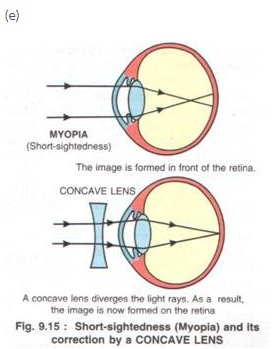 | Myopia | Lengthening of eye ball from front to back or the lens is too curved. | Using suitable concave lens |