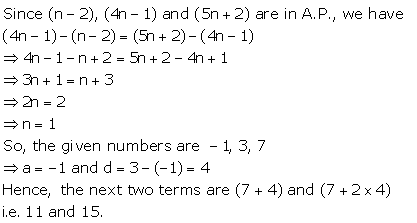 If numbers n – 2, 4n – 1 and 5n + 2 are in A.P. find the value of n and its next two terms.