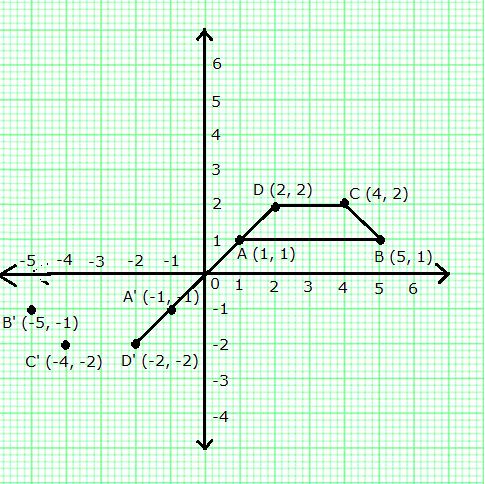 Co-ordinates of A’, B’, C’ and D’ are A'(-1, -1), B'(-5, -1), C'(-4, -2) and D'(-2, -2) respectively.