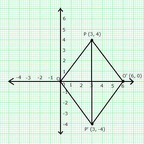 The point P (3, 4) is reflected to P’ in the x-axis; and O’ is the image of O (the origin) when reflected in the line PP’. Write: