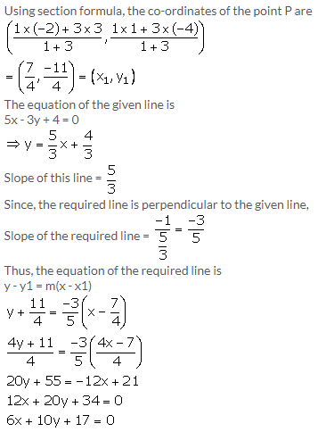 The line segment joining the points A(3, -4) and B (-2, 1) is divided in the ratio 1: 3 at point P in it. Find the co-ordinates of P. Also, find the equation of the line through P and perpendicular to the line 5x – 3y + 4 = 0.