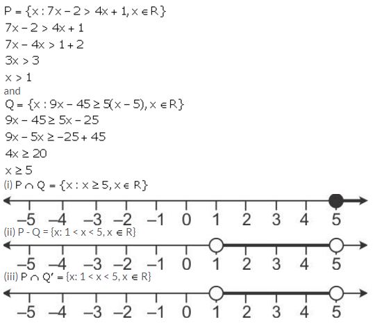 P is the solution set of 7x – 2 > 4x + 1 and Q is the solution set of 9x – 45 ≥ 5(x – 5); where x ∈ R. Represent:
