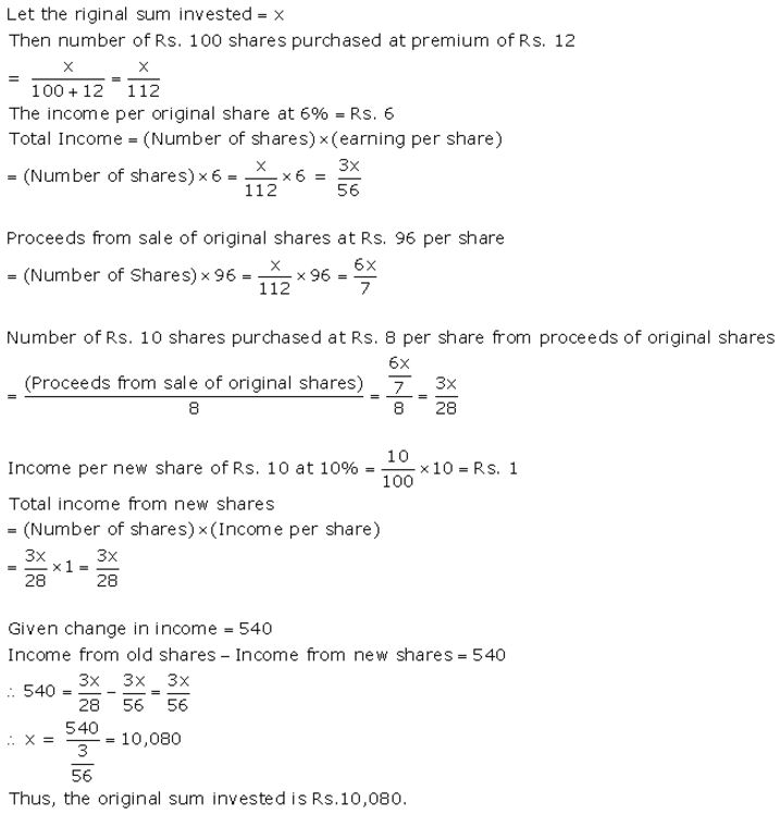 A man invests a certain sum of money in 6% hundred-rupee shares at ₹ 12 premium. When the shares fell to ₹ 96, he sold out all the shares bought and invested the proceed in 10%, ten-rupee shares at ₹ 8. If the change in his income is ₹ 540, Find the sum invested originally