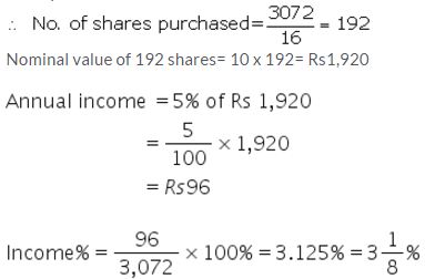 A man invests ₹ 3,072 in a company paying 5% per annum, when its ₹ 10 share can be bought for ₹ 16 each. Find :