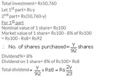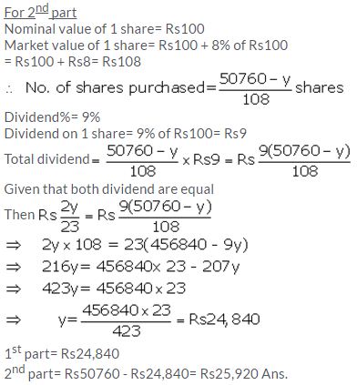Divide ₹ 50,760 into two parts such that if one part is invested in 8% ₹ 100 shares at 8% discount and the other in 9% ₹ 100 shares at 8% premium, the annual incomes from both the investments are equal.