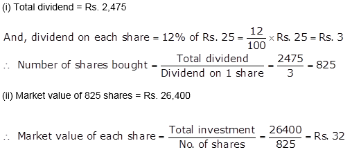 Ashok invested Rs. 26,400 in 12%, Rs. 25 shares of a company. If he receives a dividend of Rs. 2,475, find the :