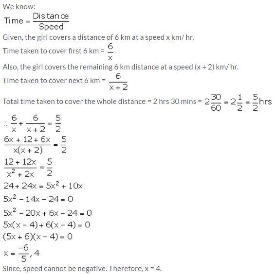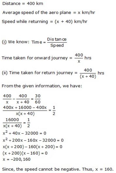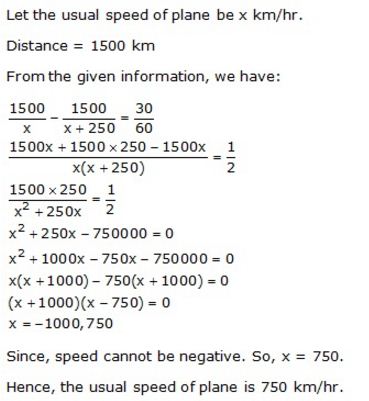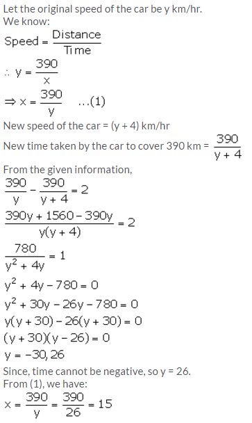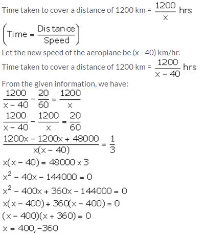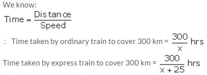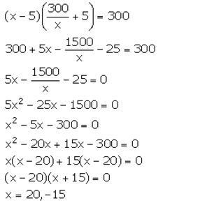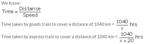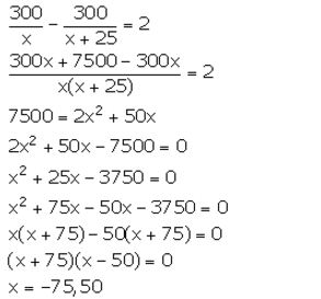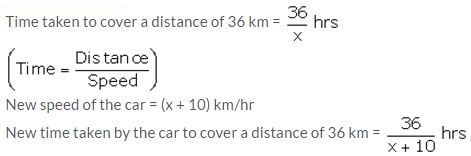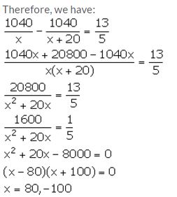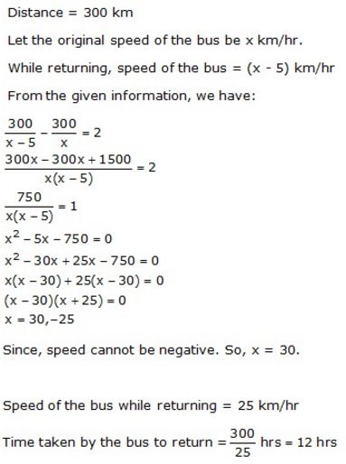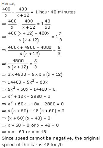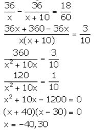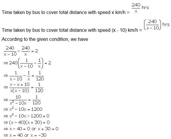 A bus covers a distance of 240 km at a uniform speed. Due to heavy rain its speed gets reduced by 10 km/h and as such it takes two hrs longer to covers the total distance. Assuming the uniform speed to be ‘x’ km/h, form an equation and solve it to evaluate ‘x’.